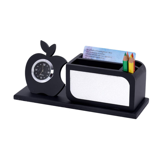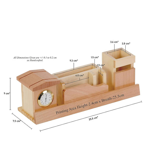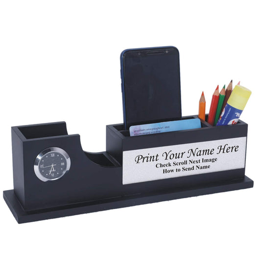 Personalized Wooden Pen Stand with Clock and Mobile Holder
