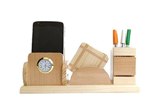 Wooden Pen Stand with Clock, Card or Mobile Holder and Tea Coasters