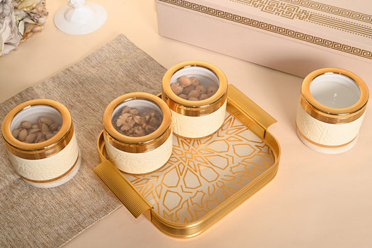 Golden Grace Dry Fruit Jar Set with Tray – Luxury Serveware for Festive Gifting