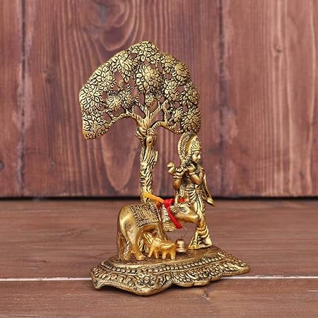 Metal Krishna with Cow Standing Under Tree Playing Flute