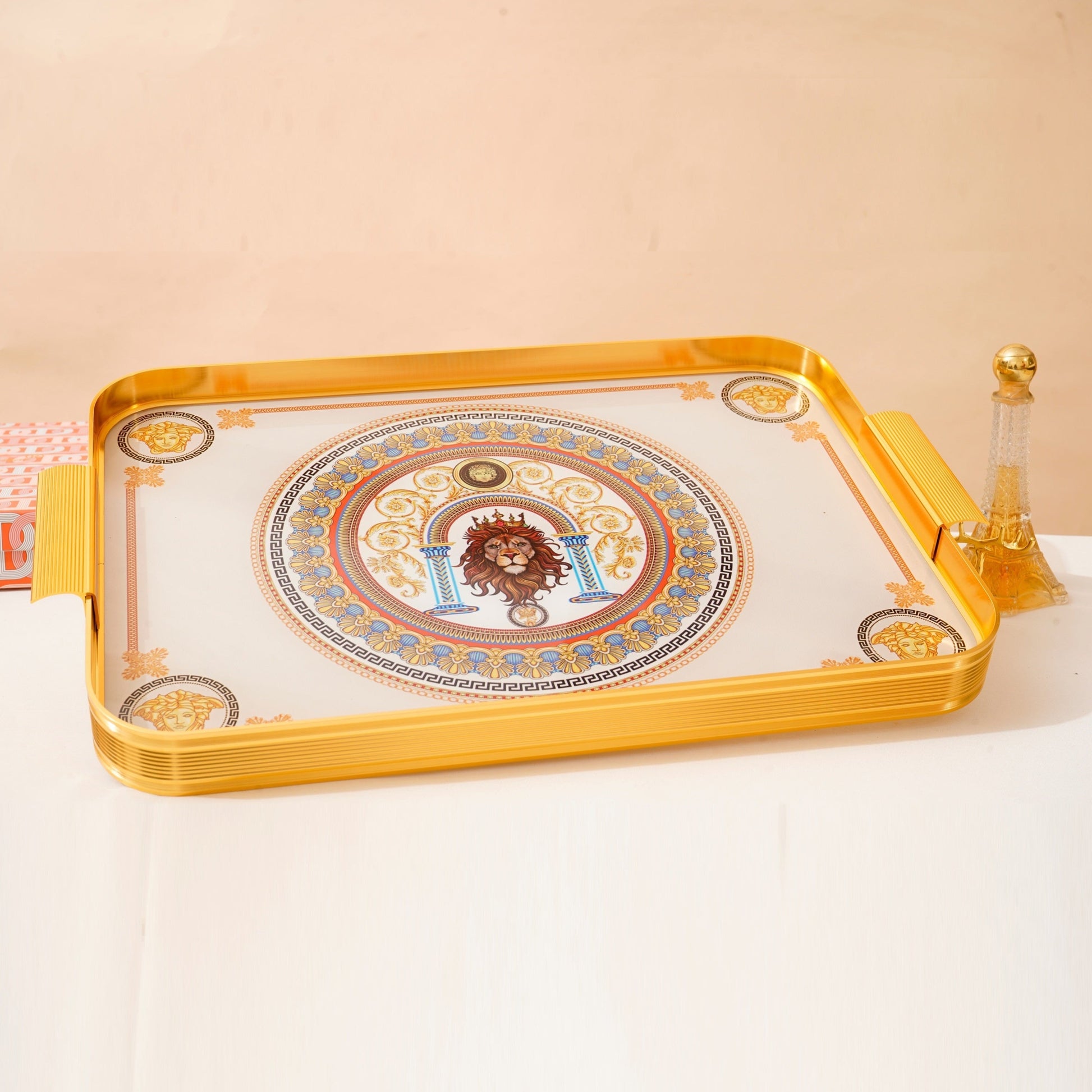 Featuring a bold lion motif surrounded by intricate golden and floral patterns, this tray is not just serveware but a symbol of power, elegance, and luxury.