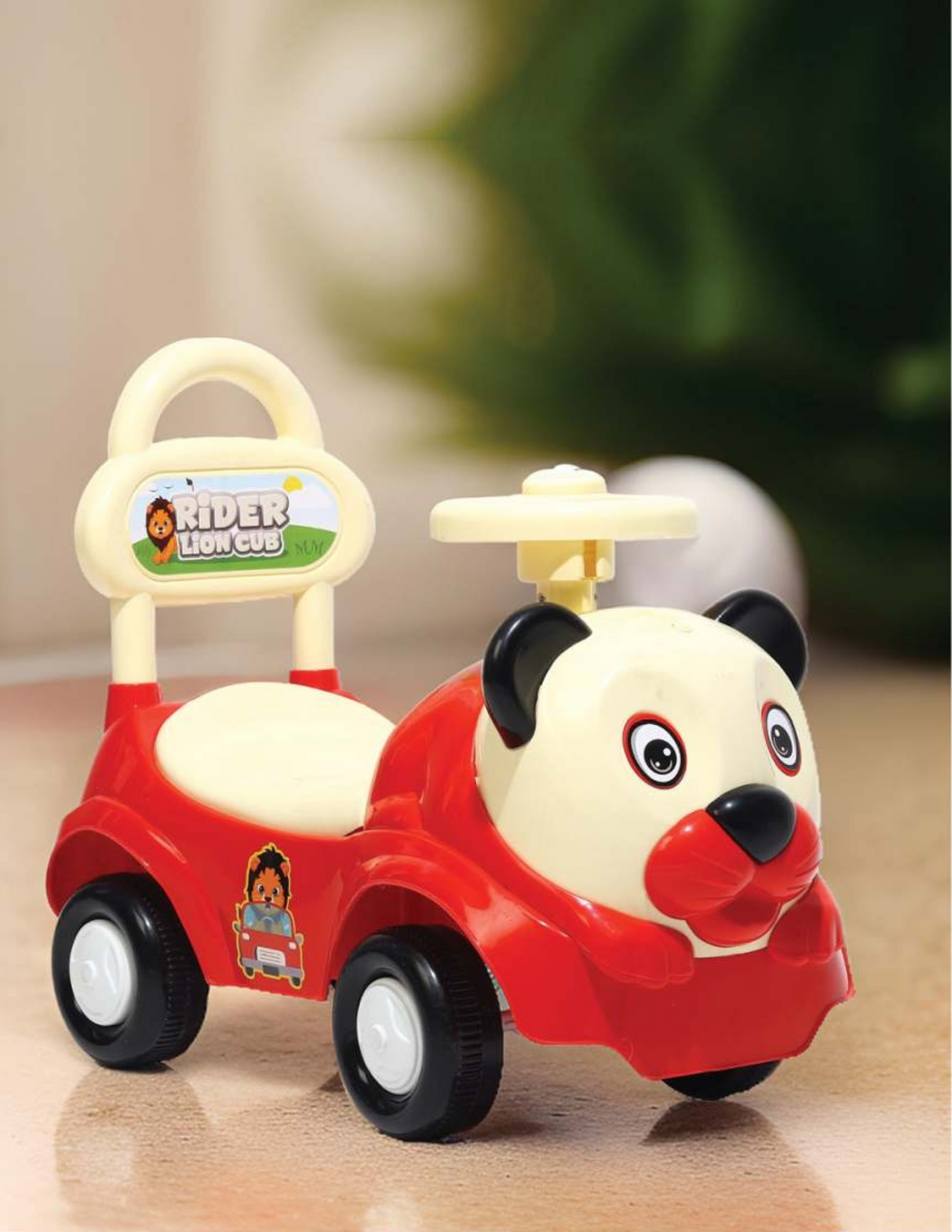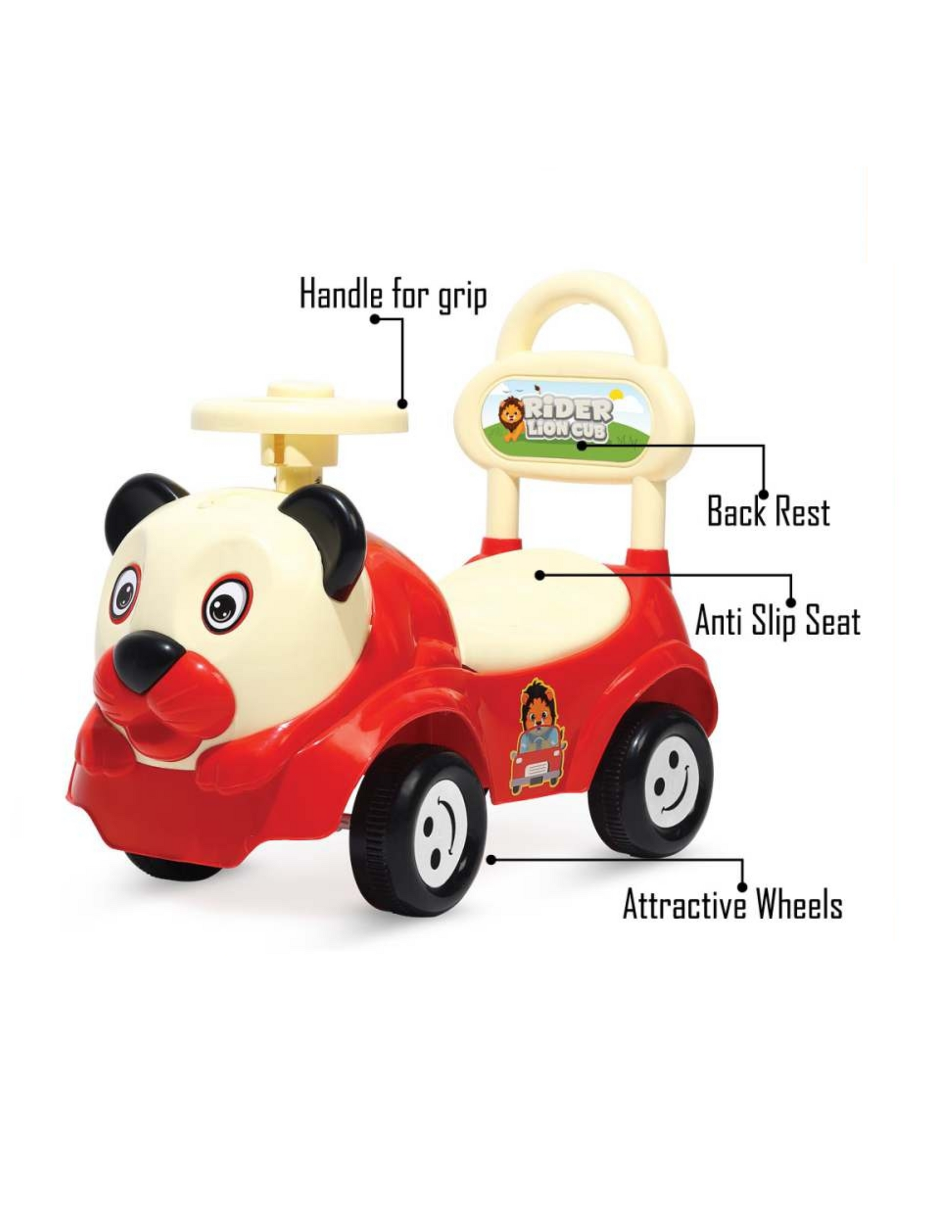 The Lion Cub Rider (Ride-On Car) is the perfect addition to your child's playtime. With its adorable lion cub design in appealing red and cream colors, this ride-on toy is sure to be a hit with young children. Constructed from durable, non-toxic materials, it guarantees a safe and long-lasting play experience. The comfortable seat, easy-grip handle, and smooth-rolling wheels make it easy for toddlers to ride and control, promoting physical activity and developmental growth. Ideal for toddlers aged 1-3 years, it makes a wonderful gift for birthdays, holidays, and special occasions, promising to bring joy and excitement to any child's playtime.
