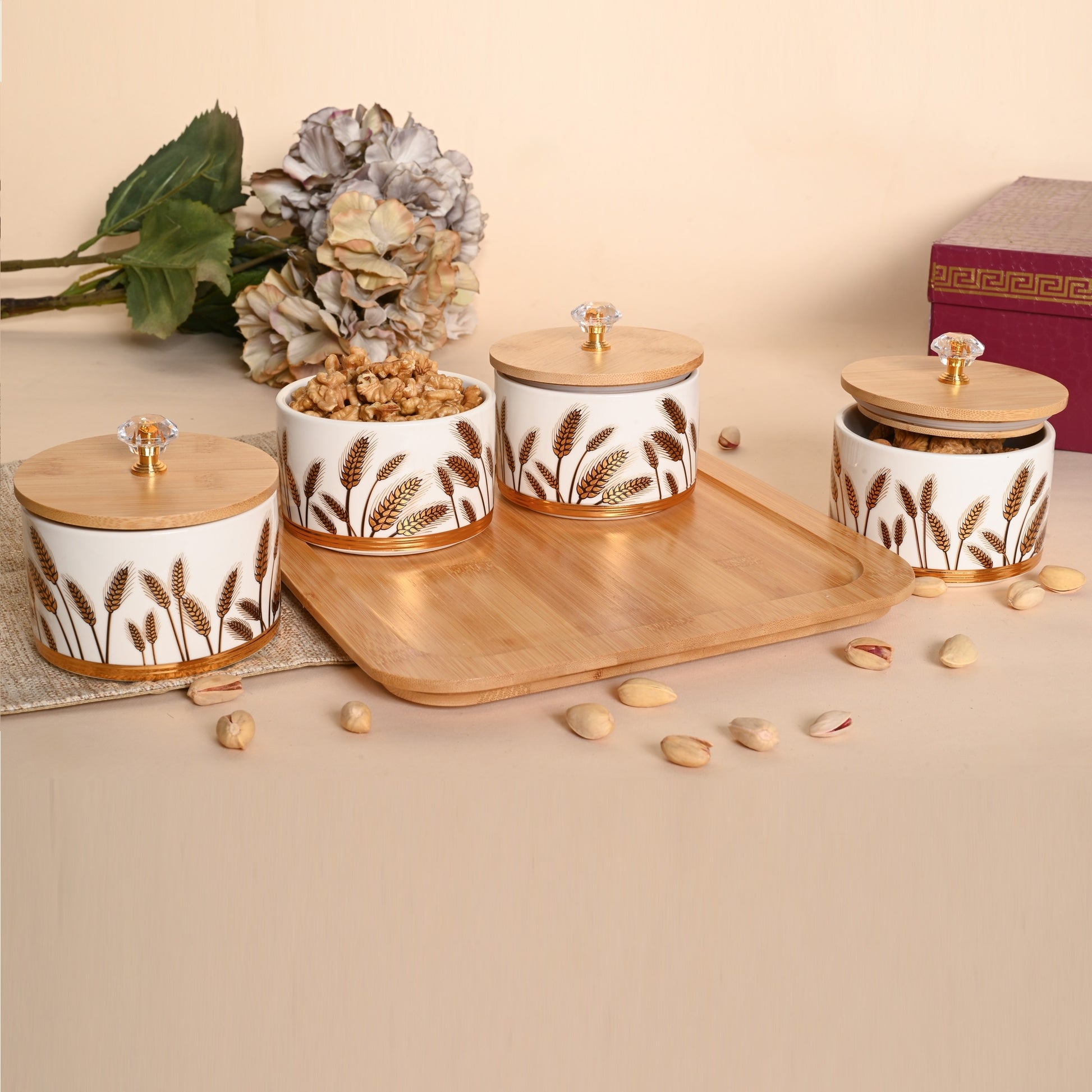 Celebrate timeless beauty and functionality with the Rustic Harvest Dry Fruit Jar Set with Tray. Each jar is designed with exquisite golden wheat patterns, representing abundance and prosperity. The bamboo lids topped with crystal knobs add a luxurious touch, while the matching wooden tray completes the set with warmth and style.